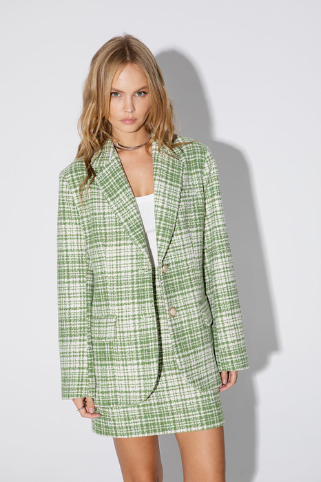 Костюм-двойка из оверсайз жакета и мини-юбки с высокой посадкой из фактурной ткани. Детали: жакет прямого силуэта, расширенная линия плеч, пиджачный воротник, перед с прорезными функциональными карманами, однобортная застежка на петли и пуговицы, спинка со средним швом и шлицей, рукава втачные двухшовные, жакет на подкладке. Юбка на притачном поясе, застежка сзади на потайную молнию, юбка на подкладке.