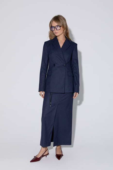 Костюм-двойка из приталенного двубортного жакета и прямой макси юбки из текстильной ткани в тонкую полоску.