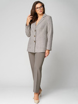 Детали: жакет полуприлегающего силуэта, рельефы, пиджачный воротник, застежка на две петли и пуговицы, функциональные карманы, жакет на подкладке. Жакет также можно зашнуровать по бокам. Брюки на притачном поясе со шлевками, застежка на молнию и пуговицу, боковые карманы, передние половины заутюженными стрелками. Задние части брюк с вытачками, стрелками и имитацией карманов. Низ брюк с широкой подгибкой, при помощи подгибки можно регулировать длину, подвернув её.