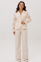 Детали: жакет с отрезными бочками и нагрудными вытачками, пиджачный воротник, прорезные карманы, застежка на петли и пуговицы, спинка со средним швом, втачные двухшовные рукава, жакет на подкладке. Юбка на притачном поясе со шлевками, талиевые вытачки, боковые карманы, застежка на потайную молнию, на подкладке.