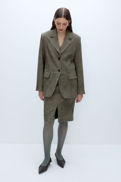 Костюм-двойка из свободного жакета и юбки-карандаш с высоким разрезом из экозамши.