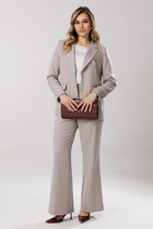 Текстильный костюм-двойка из двубортного жакета и укороченных брюк со средней посадкой.