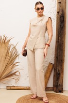 Детали: рубашка прямого силуэта, спущенная линия плеча, застежка на петли и пуговицы, длинные рукава с притачными манжетами, фигурный низ. Широкие брюки-палаццо с небольшими складками у пояса и заутюженными стрелками, притачной пояс со шлевками, застежка на молнию и пуговицу, боковые карманы. Задние части брюк с вытачками и имитацией карманов. Галстук в комплекте.