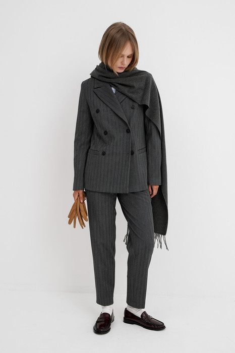 Текстильный костюм-двойка из двубортного жакета и укороченных брюк со средней посадкой.