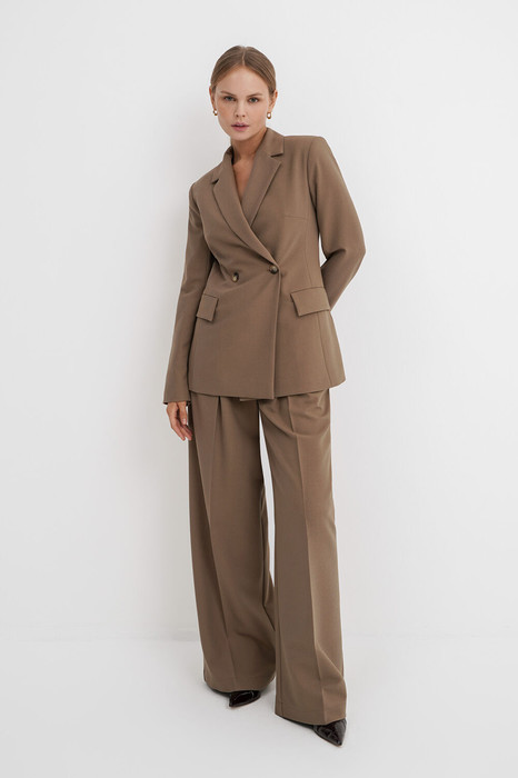 Текстильный костюм-двойка из приталенного двубортного жакета и широких брюк-палаццо.