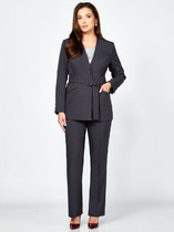 Детали: жакет свободного покроя, прямой силуэт, двубортная застежка на петли и пуговицы, пиджачный воротник, функциональные карманы, рукава длинные с регулируемой кулисой, жакет на подкладке, съемный пояс. Юбка трапециевидного силуэта, талиевые вытачки, потайная застежка, юбка на подкладке.