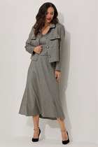 Длина жакета по спинке около 75 см в размерах 40-46 и около 78 см в размерах 48-52, длина рукава около 61 см. Длина брюк по боковому шву с поясом около 112 см в размерах 40-46 и около 113 см в размерах 48-52. Длина брюк по внутреннему шву около 81 см