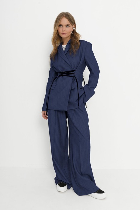 Детали: жакет полуприлегающего силуэта, рельефы, пиджачный воротник, застежка на две петли и пуговицы, функциональные карманы, жакет на подкладке. Жакет также можно зашнуровать по бокам. Брюки с притачным поясом со шлевками, складки у пояса, застежка на молнию и пуговицу, боковые карманы. Задние части брюк с вытачками и имитацией карманов.