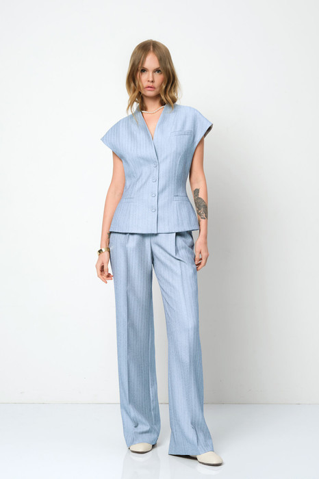 Костюм-двойка из приталенного жилета с воротником-стойкой и широких прямых брюк из текстильной ткани с рисунком «ёлочка».