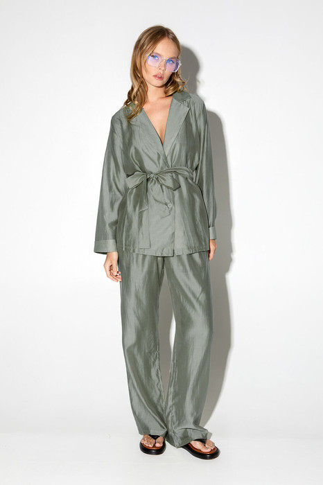 Костюм-двойка в пижамном стиле из свободной блузы и брюк из полупрозрачной вискозы.