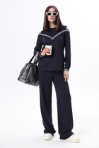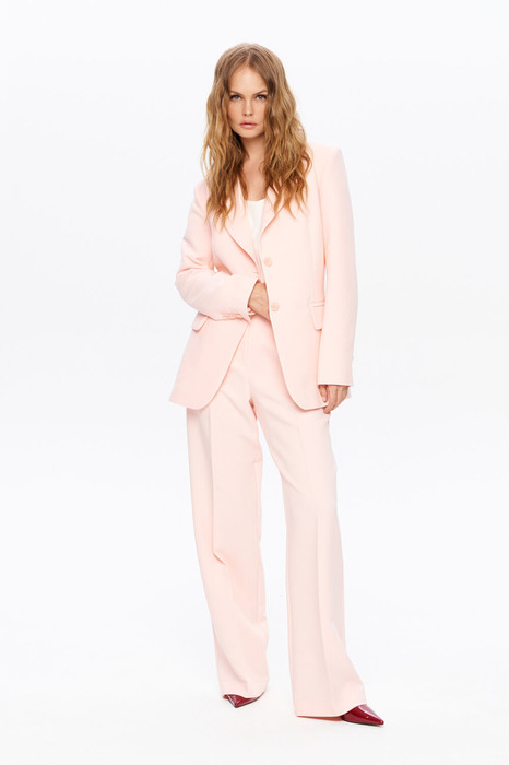 Костюм-двойка из полуприлегающего жакета со шлицами и прямых широких брюк.