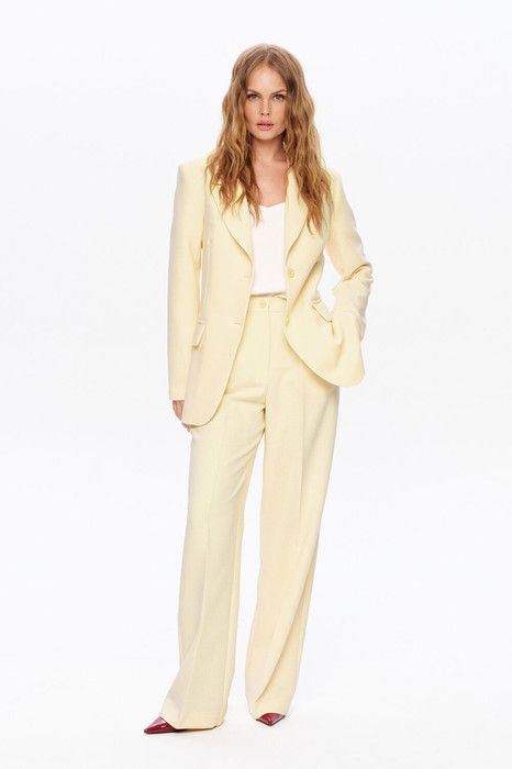 Костюм-двойка из полуприлегающего жакета со шлицами и прямых широких брюк.