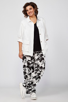 Длина жакета по спинке около 56 см в размерах 40-46 и около 58,5 см в размерах 48-52, длина рукава около 62,5 см. Длина брюк по боковому шву с поясом около 114 см в размерах 40-46 и около 115,5 см в размерах 48-52. Длина по внутреннему шву около 83 см
