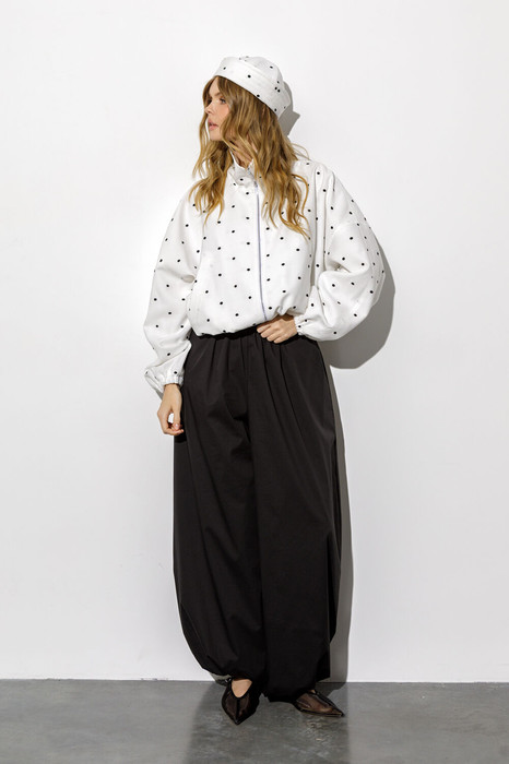 Комплект-двойка из укороченной ветровки в горошек О-силуэта и широких свободных брюк-алладинов.