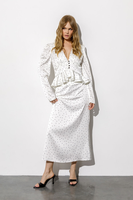 Костюм-двойка из блузы с воланами и юбки длины миди из принтованного атласа.