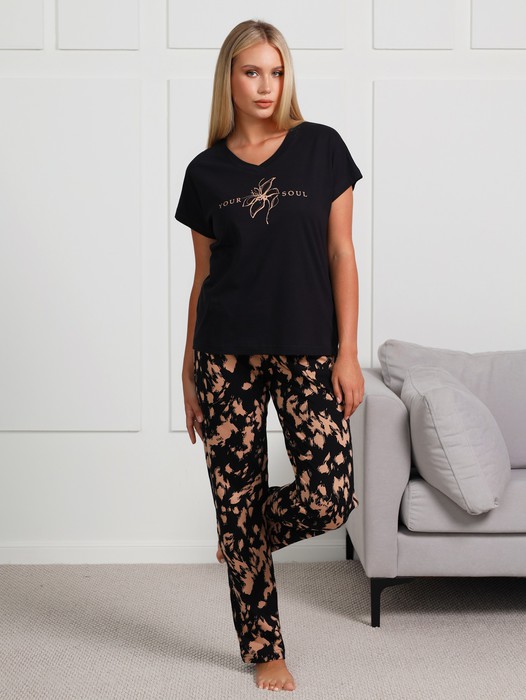 Костюм женский из трикотажного полотна «кулирка» в комбинации двух видов: с набивным рисунком и гладкокрашенного, состоящий из футболки и брюк. Футболка - из гладкокрашеного полотна, классического покроя, с цельнокроеными рукавами, горловиной V- образной формы и принтом на полочке, выполненным в технике «шелкографии». Горловина обработана втачной планкой из основного материала.Брюки - из полотна с набивным рисунком, свободного покроя, с карманами в боковых швах, на притачном поясе с эластичной тесьмой внутри.