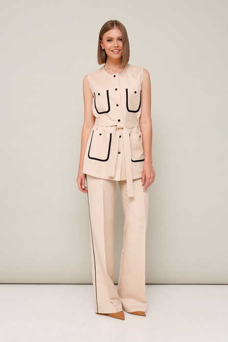 Жилет полуприлегающего силуэта с центральной застежкой на петли и пуговицы. Спереди обработаны накладные карманы по линии груди и в области бедер с контрастной окантовкой. Жилет дополнен поясом. Срез обтачки спинки и подборта окантован, без подкладки.