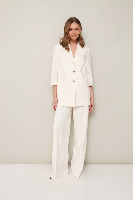 Жакет современного прямого силуэта из костюмной ткани с центральной застёжкой на петли и пуговицы. Воротник пиджачного типа с отложными лацканами. Спереди обработаны накладные карманы. Спинка с V-образным вырезом, который зашнурован акцентной декоративной тесьмой. Рукава втачные, длина 3/4. Изделие на х/б подкладке.