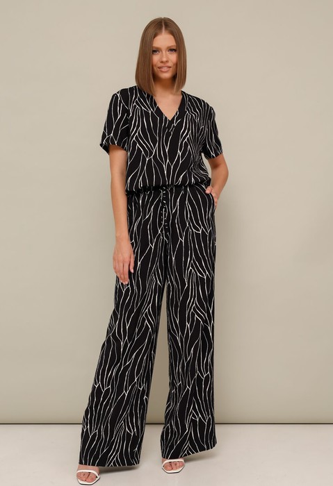 вырезом. Рукава короткие, со слегка спущенной линией втачивания плеча. По низу блузки, в боковых швах, обработаны разрезы. Брюки прямого кроя с высокой посадкой. Пояс брюк