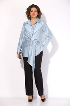 Нижнее платье-комбинация полуприлегающего силуэта. V-образный вырез горловины. Перед с нагрудными вытачками. Бретели регулируются по длине. По низу платья выполнена отделка в виде настрочного кружева. Лацканы, карманылисточки, завязки в области талии и нижнее платье-комбинация выполнены из гладкой ткани с благородным матовым блеском.