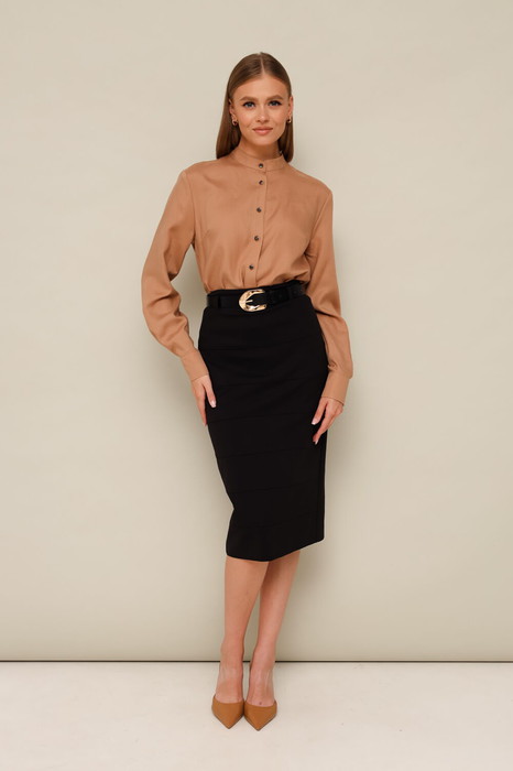 Юбка-карандаш с посадкой на талии и горизонтальными подрезами по переду. Обтачной пояс, застежка на потайную тесьму-молнию в среднем шве спинки. Для удобства движения сзади обработана шлица. В юбке предусмотрены шлевки.