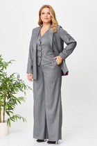 Жилет современного прямого силуэта с бортами на запах, застёжка на петли и пуговицы. Спинка со средним швом. Изделие на х/б подкладке. Брюки прямого силуэта из костюмной ткани с заутюженными стрелками. Пояс притачной с застежкой на пуговицу и тесьму-молнию, сзади обработана резинка для регуляции размера по талии.