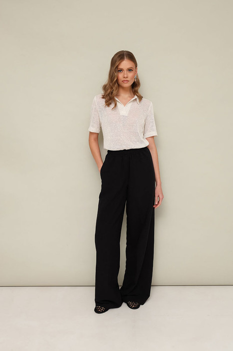 Стильный 2-х предметный комплект, состоящий из поло и брюк. Поло с отложным воротником с цельнокроеной стойкой, V-образный вырез горловины обработан притачными планками. Короткие втачные рукава. Брюки прямого силуэта с боковыми наклонными карманами, спереди обработана имитация гульфика. Пояс притачной на резинке, для регуляции размера. Длина брюк разработана с учетом усадочных свойств натуральной ткани.