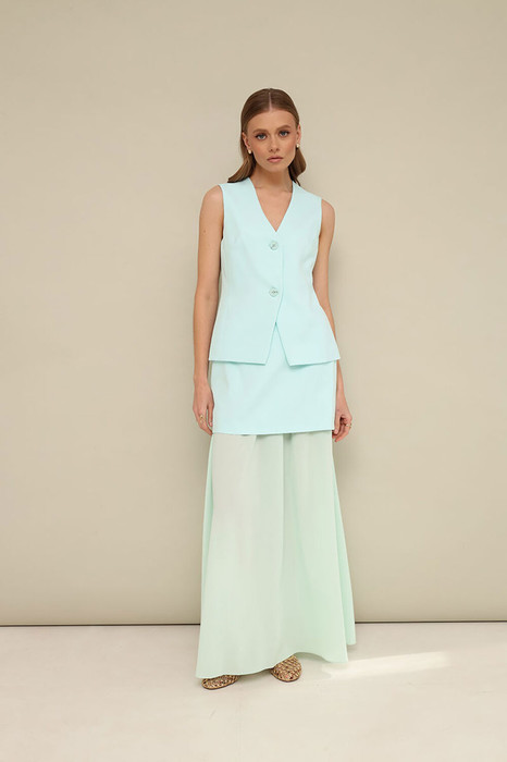 Стильный 2-предметный костюм, состоящий из жилета и юбки, выполнен из костюмно-плательной ткани и креп-шифона.