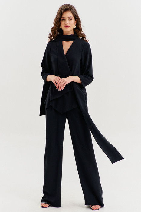 Комплект, состоящий из блузки и брюк. Блузка свободного кроя с фигурной линией низа. Спинка с наклонным швом с цельнокроеной планкой. Перед на запах, ассиметричный. Правый перед с воротником апаш, по борту вставлен широкий пояс. Левый перед с воротником шаль с длинным отлетным краем. По левому переду настрочена шлевка. По плечу, с правой стороны настрочена шлевка для отлетного края воротника. Застежка на петли и пуговицы. Рукава одношовные, втачные, длиной 3/4. Брюки длинные, широкие. По задним половинкам талиевые вытачки. По передним половинкам односторонние складки, боковые карманы и застежка на тесьму-«молнию» с гульфиком и откоском. Брюки на притачном поясе, по спинке с резинкой. По поясу вставлены шлевки.