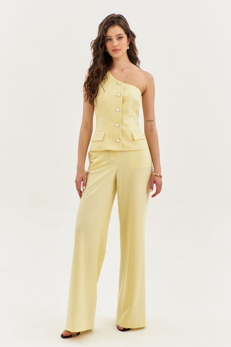 Комплект женский, состоящий из жилетки и брюк. Жилетка полуприлегающего силуэта, выполнена на одно плечо, длиной чуть выше линии бедер. Спинка со средним швом и рельефами. По переду рельефы, обработаны карманы с листочкой и клапаном. Жилетка без воротника. Застежка по переду на петли и пуговицы. Жилетку дополняет съемная регулируемая бретель. Жилетка на подкладке. Брюки прямого силуэта, на притачном поясе с резинкой по спинке. По задним половинкам талиевые вытачки. По передним половинкам обработаны боковые карманы с наклонным входом, и застежка на тесьму-«молнию» с гульфиком и откоском. По поясу застежка на петлю и пуговицу.