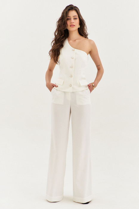 Комплект женский, состоящий из жилетки и брюк. Жилетка полуприлегающего силуэта, выполнена на одно плечо, длиной чуть выше линии бедер. Спинка со средним швом и рельефами. По переду рельефы, обработаны карманы с листочкой и клапаном. Жилетка без воротника. Застежка по переду на петли и пуговицы. Жилетку дополняет съемная регулируемая бретель. Жилетка на подкладке. Брюки прямого силуэта, на притачном поясе с резинкой по спинке. По задним половинкам талиевые вытачки. По передним половинкам обработаны боковые карманы с наклонным входом, и застежка на тесьму-«молнию» с гульфиком и откоском. По поясу застежка на петлю и пуговицу.