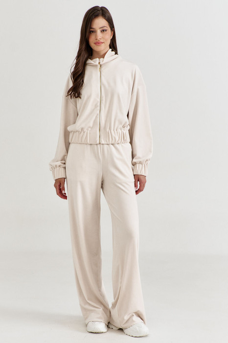Комплект, состоящий из бомбера и брюк. Бомбер, свободного кроя, длиной чуть ниже талии. По переду застежка на декоративную тесьму-«молнию».  По горловине воротник стойка. Линия плеча спущена. Рукава длинные, по низу с притачной манжетой, в которую вставлена резинка. По  низу бомбера вставлена резинка. Брюки свободного кроя, длинные, на притачном поясе с резинкой. В боковых обработаны карманы с наклонным входом.