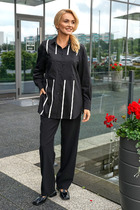 Комплект женский относится к торжественной одежде. Комплект женский 3-х предметный джемпер, топ и брюки. Джемпер прямого силуэта, с фигурным низом. Перед и спинка цельнокроеные, с притачной планкой из отделочной ткани по горловине. Джемпер со спущенным плечом. Рукав втачной, одно шовный, длинный, с притачной манжетой, собранной на эластичную тесьму. Джемпер без плечевых накладок. Топ женский прямого силуэта, длиной до линии бёдер. Перед с 2-мя нагрудными вытачками. Спинка цельнокроеная. Горловина круглая, без воротника. Проймы обтачные. Топ на подкладке. Брюки женские прямые широкие, длинные. Передние половинки с односторонними складками и карманами в боковых швах. Задние половинки с таллиевыми вытачками. Брюки с притачным поясом, собранным на эластичную тесьму, закреплённую 2-мя отделочными строчками.