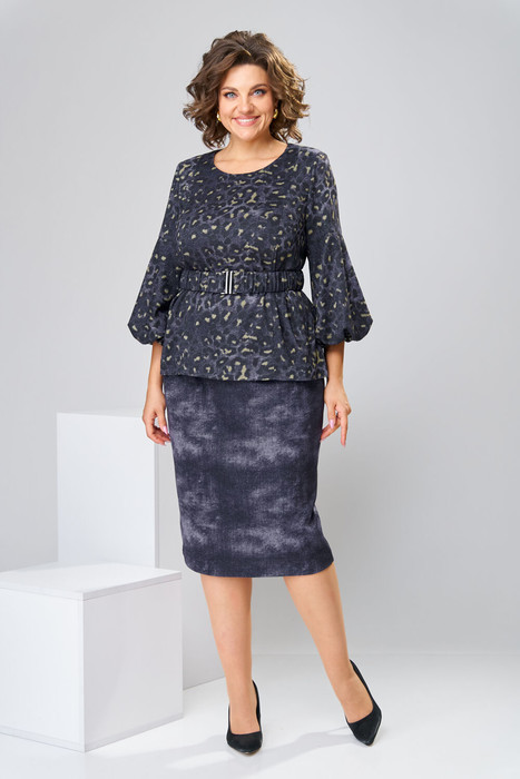 Костюм женский предназначен для повседневной носки. Костюм женский 2-х предметный блузон и юбка. Блузон женский полу прилегающего силуэта, длиной ниже линии бёдер на 3 см. Перед с 2-мя рельефами, выходящими из плечевых швов, на уровне линии талии с подрезами, нижние части подрезов со встречными складками. Спинка цельнокроеная. Горловина круглая обточная, без воротника. Рукав втачной, одно шовный, длиной 3/4 с горизонтальным подрезом, нижняя часть рукава расширена к низу, с 5-тью встречными складками, низ рукава обтачной, нижняя часть рукава на подкладке. Блузон с плечевыми накладками. Юбка женская, слегка заужена к низу, длиной ниже колена. Переднее полотнище цельнокроеное. Заднее полотнище со средним швом, заканчивающимся разрезом. Юбка с притачным поясом, собранным на эластичную тесьму. Юбка на подкладке. Костюм со съёмным поясом, с металлической пряжкой, пояс собран на эластичную тесьму. Длина юбки по боковому срезу 69 см. Длина спинки блузона 63 см, длина рукава 46 см.