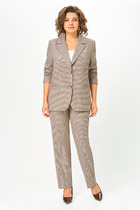 Костюм женский, предназначен для повседневной носки. Костюм женский, 2-х предметный блузка и брюки. Блузка женская, удлинённая прямого силуэта, длиной до середины колена. Перед с 25-мя нагрудными вытачками, выходящими из плечевых швов, с 2-мя накладными прямоугольными карманами на уровне груди, левый декорирован пришивным украшением, с 2-мя притачными вертикальными планками по горловине и краю борта. Спинка с отрезной кокеткой и встречной складкой по центру. Горловина с V-образным фигурным вырезом с втачным воротником рубашечного типа с отрезной стойкой. Застёжка центральная на 5-ть вертикально-обмётанных петель и 5-ть пришивных пуговиц. Боковые швы с высокими разрезами. Рукав втачной одно шовный длиной 7/8 с патой, фиксирующейся на пришивную пуговицу и регулирующей длину рукава. Блузка с плечевыми накладками. Брюки женские прямые широкие длинные. Передние половинки с карманами в боковых швах с отрезными бочками. Задние половинки с таллиевыми вытачками. Брюки с притачным поясом, собранным на эластичную тесьму, закреплённую 2-мя отделочными строчками. Длина брюк по боковому срезу 106 см. Длина спинки туники 100 см, длина рукава 50 см.