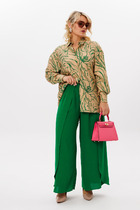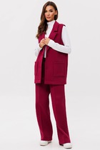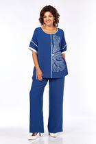 Костюм женский, 2-х предметный, блузка и брюки. Блузка женская, прямого силуэта, длиной ниже линии бёдер, с фигурным низом "ступенька". Перед цельнокроенный, с настрочным декором слева, с настрочной отделочной тесьмой. Спинка цельнокроенная. Горловина круглая, обточная, без воротника, длиной до локтя с притачной манжетой из отделочной ткани. Боковые швы с разрезами. Блузка без плечевых накладок. Брюки женские, прямые, длинные. Передние половинки с карманами в боковых швах. Задние половинки без конструктивных особенностей. Брючки с притачным поясом, собранным на эластичную тесьму (частично) и закреплённую 2-мя отделочными строчками. Длина спинки блузки 68,5 см, длина рукава 49 см. Длина брюк 105 см.