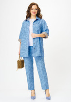 Комплект женский предназначен для повседневной носки. Комплект двухпредметный: жакет и платье. Жакет полуприлегающего силуэта, удлиненный, длиной ни же колена на 4 см. Перед с двумя нагрудными вытачками, с двумя отрезными бочками, в швах соединения бочков с передом обработаны карманы. Спинка со средним швом и двумя талиевыми вытачками. Горловина с V-образным вырезом с втачным воротником пиджачного типа с отложным лацканом. Застежка центральная бортовая на 6 пробивных металлических кнопок. Рукав втачной, двухшовный, длинный. жакет с плечевыми накладками, на подкладке. Платье женское полуприлегающего силуэта, длиной за колено. Перед с двумя нагрудными вытачками. Спинка цельнокроеная. Горловина круглая, с притачной планкой, с -образным разрезом. Рукав втачной, одношовный, длиной 3\4. Горловина декорируется пришивным украшением. Платье на подкладке с плечевыми накладками. Длина жакета 105 см. Длина рукава жакета 60 см. Длина платья 102 см. Длина рукава платья 44 см