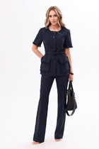 Комплект, состоящий из жакета и шорт из легкой костюмной ткани на подкладке. Двубортный жакет выполнен в стиле оверсайз. Воротник-с отложными лацканами пиджачного типа, рукава – двухшовные. Карманы в боковых швах. Жакет застегивается на две основные пуговицы, одну потайную, остальные пуговицы несут декоративный характер. Шорты с наклонными боковыми карманами и широким поясом-обтачкой. Застегиваются на молнию по переду и пуговицу.