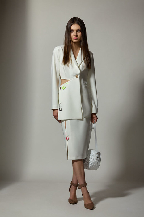 Комплект из костюмной ткани на подкладке, состоящий из жакета и юбки. Жакет приталенного силуэта. Верхняя часть переда с рельефами, вытачками.  В левой части переда - прорезной карман в рамку. В правой нижней части переда отлетная деталь, застегивающаяся на пуговицу. Спинка с рельефами, отрезная по линии талии. Жакет застегивается на пуговицу и внутреннюю кнопку. Жакет декорирован цветными булавками. Юбка на подкладке, слегка зауженная к низу, без пояса. Верх юбки обработан обтачкой. В рельефе юбки разрез, обеспечивающий свободу движения и щель, декорированная булавкой.  Застежка - молния в среднем шве юбки.