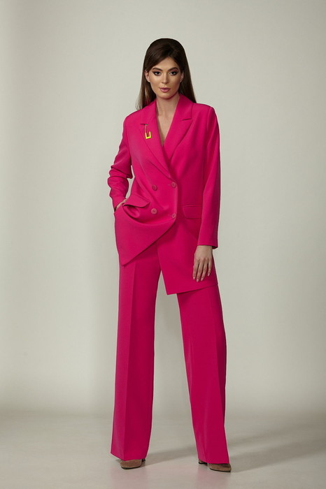 Брючный комплект из костюмной ткани на подкладке. Двубортный жакет выполнен в стиле оверсайз. Воротник-с отложными лацканами пиджачного типа, рукава – двухшовные. По переду- прорезные карманы с клапанами. Жакет имеет два ряда пуговиц, застегивается на две основные пуговицы, одну потайную, остальные пуговицы несут декоративный характер. Изюминка комплекта- декоративная булавка лимонного цвета. Брюки прямые со складкой, широким поясом-обтачкой, наклонными карманами. Застегиваются на молнию по переду и пуговицу.