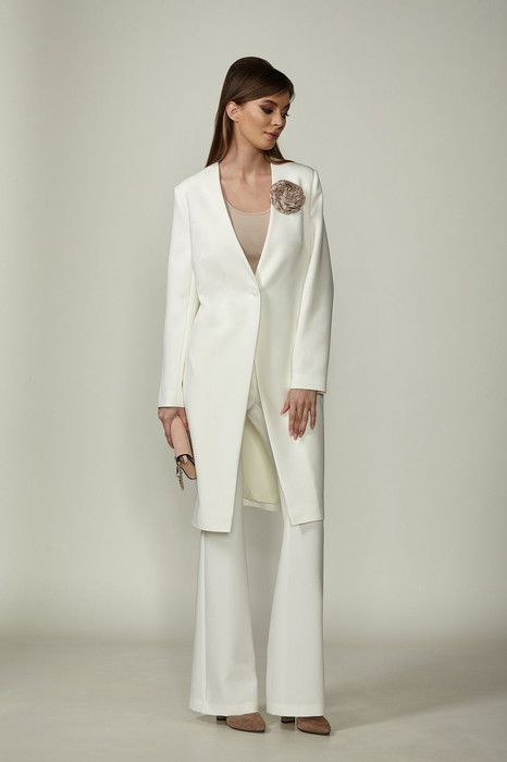 Брючный комплект из костюмной ткани на подкладке.  Жакет прямого силуэта с двумя наклонными вытачками и карманами в боковых швах. Рукава - длинные, двухшовные. Жакет застегивается на 1 пуговицу. Цветок ручной работы  в виде пиона станет украшением комплекта.  Брюки - клеш  расширены к низу, с началом расширения выше колена 5 см. Брюки с двумя карманами округлой формы и поясом-обтачкой.  Застегиваются на молнию по переду и  одну пуговицу.
