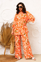 Брючный комплект из костюмной ткани на подкладке.  Жакет прямого силуэта с двумя наклонными вытачками и карманами в боковых швах. Рукава - длинные, двухшовные. Жакет застегивается на 1 пуговицу. Цветок ручной работы  в виде пиона станет украшением комплекта.  Брюки - клеш  расширены к низу, с началом расширения выше колена 5 см. Брюки с двумя карманами округлой формы и поясом-обтачкой.  Застегиваются на молнию по переду и  одну пуговицу.