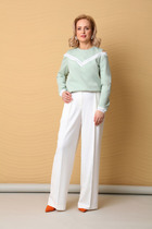 Комплект женский, состоящий из жакета и брюк, выполнен  из стрейчевой  костюмной ткани на подкладке. Жакет полуприталенного  силуэта с рельефами по переду и спинке, отрезной по линии талии, с баской. Карманы-эмитация. Воротник - пиджачного типа. Рукава - втачные,  двухшовные.  Застежка на 2 пуговицы. Съемная брошь-цветок входит в комплект.  Брюки слегка заужены к низу, с поясом.  Застегиваются на молнию по переду и  одну пуговицу.