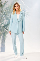 Брючный комплект из костюмной ткани на подкладке. Двубортный жакет полуприталенного силуэта с отрезными бочками и вытачками по переду и спинке. Воротник-с отложными лацканами пиджачного типа. По переду - прорезные карманы с клапанами. Рукава длинные, двухшовные. Жакет застегивается на две пуговицы. Брюки-клеш, плотно сидящие по фигуре, с началом расширения 5см выше колена. Брюки с карманами по переду и обтачкой-поясом. Застегиваются по переду на молнию и пуговицу.