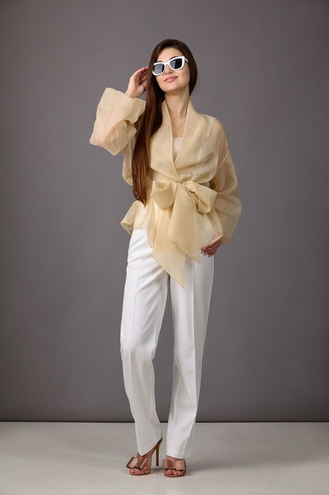 Брючный комплект ,состоящий из блузы и брюк. Прозрачная блуза из вуали  немного расширена к низу, с планкой по горловине и бортам.  Рукава-балон. Завязывается на пояс (идет в комплекте). Брюки прямого силуэта с наклонными карманами и поясом. Величина пояса регулируется резинкой. Застегиваются на молнию  пуговицу по переду.