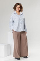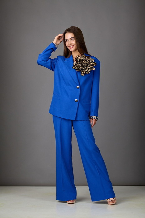 Двубортный жакет прямого силуэта с вытачками по переду. Карманы с листочками. Воротник - пиджачного типа. В среднем шве спинки - планка, застегивающаяся на пуговицы. Рукава - втачные,  двухшовные.  Застежка на 2 пуговицы и одну потайную. Цветок-брошь входит в комплект. Широкие брюки с поясом и карманами. По бокам пояса-резинка.Застегиваются по переду на молнию и пуговицу.