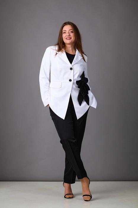 Комплект женский, состоящий из жакета и брюк, выполнен  из стрейчевой  костюмной ткани на подкладке. Жакет полуприталенного  силуэта с рельефами по переду и спинке, отрезной по линии талии, с баской. Карманы-эмитация. Воротник - пиджачного типа. Рукава - втачные, двухшовные.  Застежка на 2 пуговицы. Брошь ручной работы съемная. Брюки слегка заужены к низу, с поясом. Посадка-средняя. Застегиваются на молнию по переду и одну пуговицу.