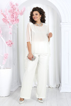 Стильная новинка на весну, несомненный хит будущего сезона- комплект из теплой молочной ткани с геометрией шикарного черного канта. Лаконичный жакет полуприталенного силуэта с воротником "апаш". Рукава двухшовные, длинные. Застежка на пришивные кнопки. Брюки широкие, со средней посадкой, с кантом по бокам. В поясе резинка для корректировки объема. Длина брюк-113см (44-46р), 113,5см (48-50р), 114см (52-54р)