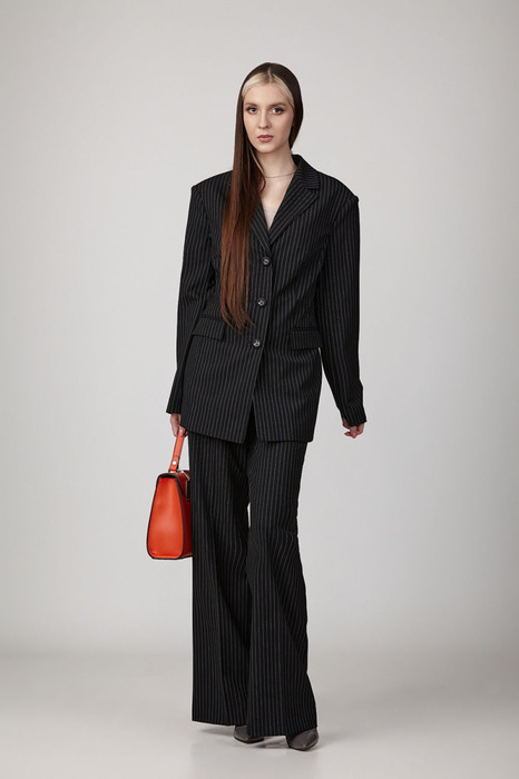 Брючный комплект из костюмной ткани на подкладке.  Жакет с расширенной линией плеч, с отрезными бочками по переду и спинке и вытачками по переду. Воротник-с отложными лацканами пиджачного типа. По переду - прорезные  карманы  с клапанами. Рукава длинные, двухшовные. Жакет застегивается на три пуговицы. Брюки прямые со складкой, широким поясом-обтачкой, наклонными карманами. Застегиваются на молнию по переду  и пуговицу.