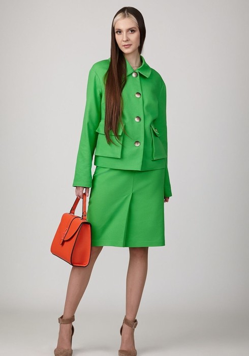 Комплект женский на подкладке из джинсовой ткани. Жакет  прямого силуэта, по переду нагрудные вытачки и  объемные карманы-портфели с клапанами. Пройма спущена, рукава узкие. Воротник  с притачной стойкой. Застегивается на  4 пуговицы. Юбка прямая с наклонными карманами и складкой по переду , с широким поясом-обтачкой. Застегиваются на молнию сзади.
